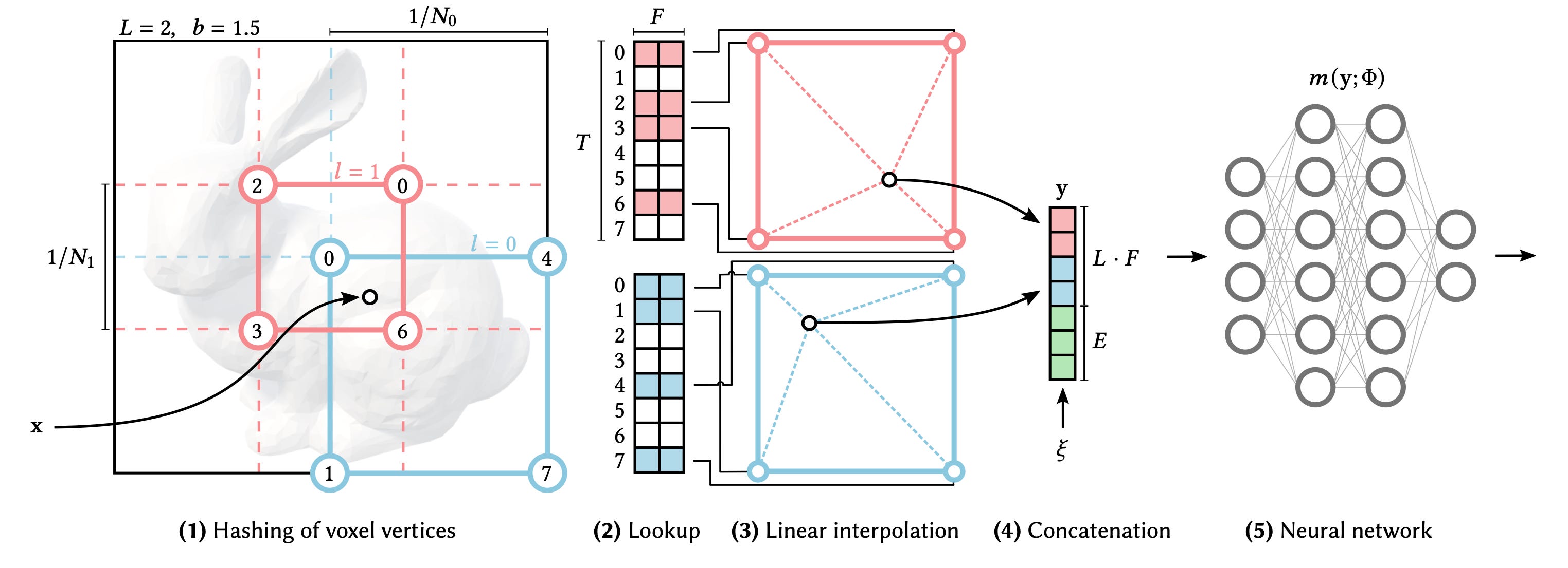 Here is the crux of the method for the curious. Figure below illustrates this in 2D. Imagine there is a 3D voxel grid in the 3D space. For a given 3D point in space, we find the 8 corner points of its enclosing voxel. Each of these 8 points is mapped to an integer value using a known spatial hash function. We use these integers to find the corresponding feature vectors in a lookup table. So each of the 8 points has a feature vector. For our point, we use trilinear interpolation to combine these 8 points to a single feature vector F